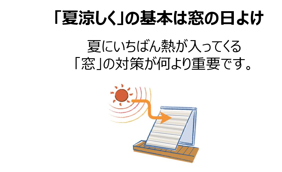 そのため、夏の太陽から熱エネルギーは建物に入る前に遮ったほうが冷暖房費を節約できます。(日よけは窓の外で行いましょう)