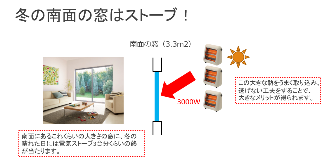 冬の太陽高度は夏に比べて低くなりますから、南に面している窓から多くの太陽光が入ってきます。