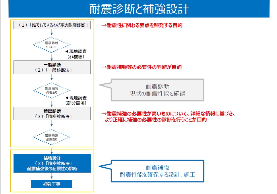 木造住宅の耐震診断の基準は、「木造住宅の耐震診断と補強方法」(財団法人日本建築防災協会)が広く利用されており、「誰でもできるわが家の耐震診断」、「一般診断法」、「精密診断法」の3つの方法があります。