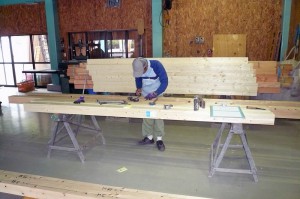 墨付け(木材に加工する線をつける)は24歳の平林君(大工育成塾卒業後3年経ちました)