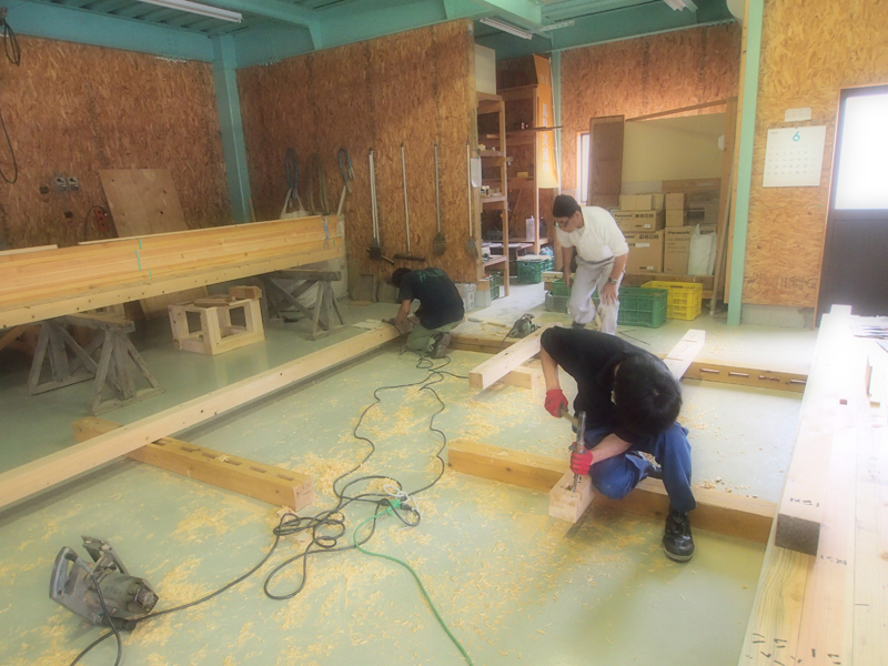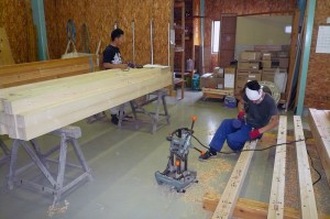 刻んでいる(木材を加工する)のは20歳の寺島君(大工育成塾の2年生)