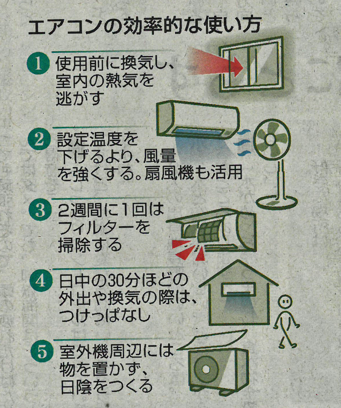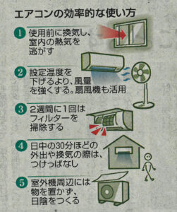 一方で、厳しい暑さが続きエアコンの使用は欠かせません。消費電力を抑えつつ、快適な生活を過ごすためにエアコンの上手な使い方が中日新聞に載っていましたので、その記事を紹介します。