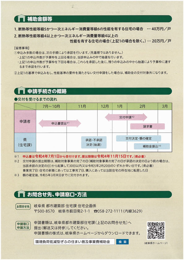 岐阜県内で高い省エネルギー性能等を有する住宅を取得(新築・購入)した場合、40万円または20万円の補助があります。