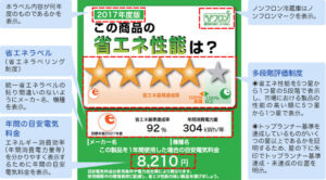 まずは、ラベルについているマークに注目!これは「省エネ性マーク」と呼ばれ、省エネ基準を満たしている場合はグリーン、未達成の場合はオレンジで表示されています。