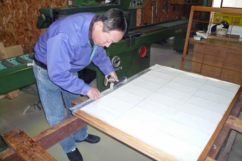 木材にしっかりと付くように指で障子紙を押さえます。