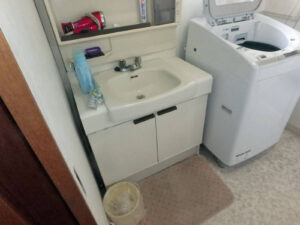 洗面室の天井・壁・床のクロス、クッションフロアーの張り替えと洗面台の取替