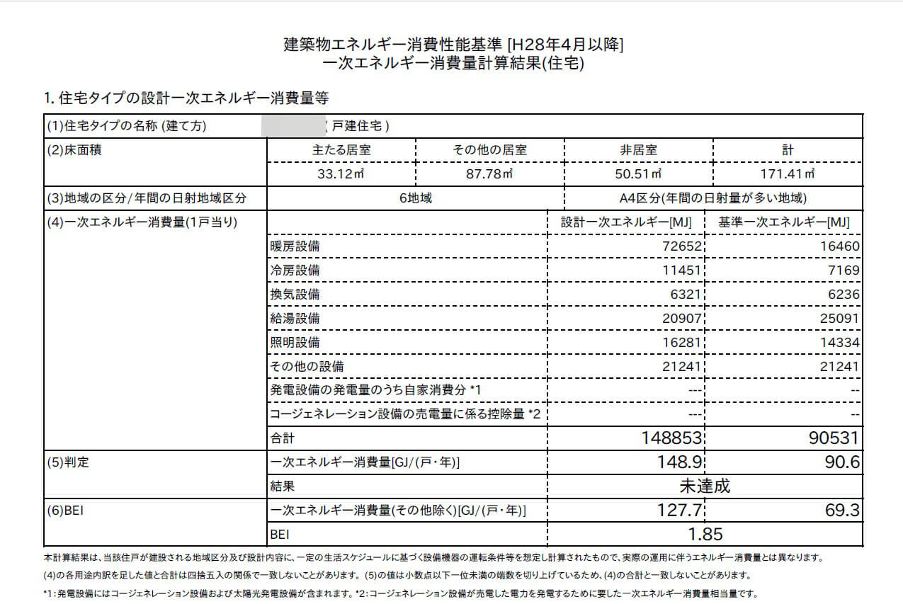 BEIとは、「基準一次エネルギー消費量」に対する「設計一次エネルギー消費量」の割合のことで、BEIの値が小さいほど、省エネルギーです。