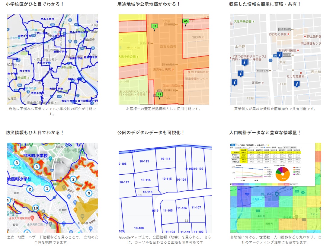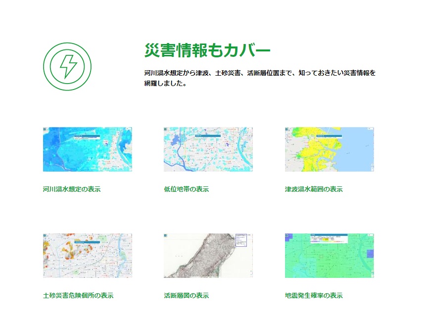 ほかにも小学校区や用途地域、地価公示、土地相場情報といった営業時に役立つ情報や、浸水想定や土砂災害警戒区域などのハザード情報も表示ができます。