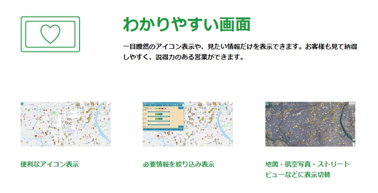 不動産会社が所有する土地や建物の情報を、まとめて地図上に表示できるので、希望する物件がどの場所にあるのかを、分かりやすく把握できます。