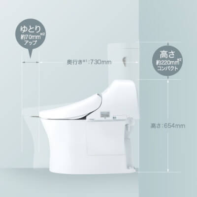 高さも奥行もコンパクトなので、トイレ空間を広く使え、すっきりとしたスタイリッシュなトイレ空間をつくることが出来ます。