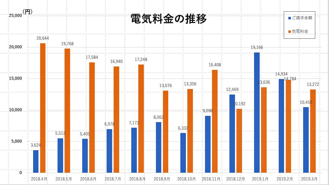 棒グラフを見てもらうとわかりやすいですが、12月と、1月と、2月は太陽光パネル売電収入より、使用した電気代の方が多いです。そのほかの月は売電金額の方が多いです。