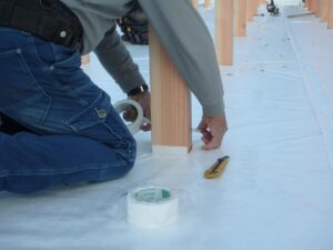 建前の時には、桁上の合板と束を気密テープで処理します。