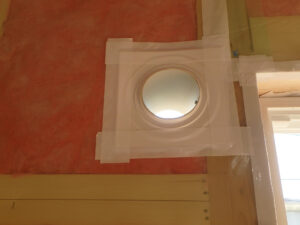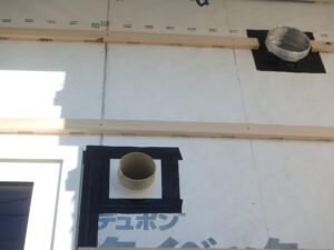 排気ダクトやエアコンスリーブ管は配管周り用の気密部材を室内と室外に取付けます。