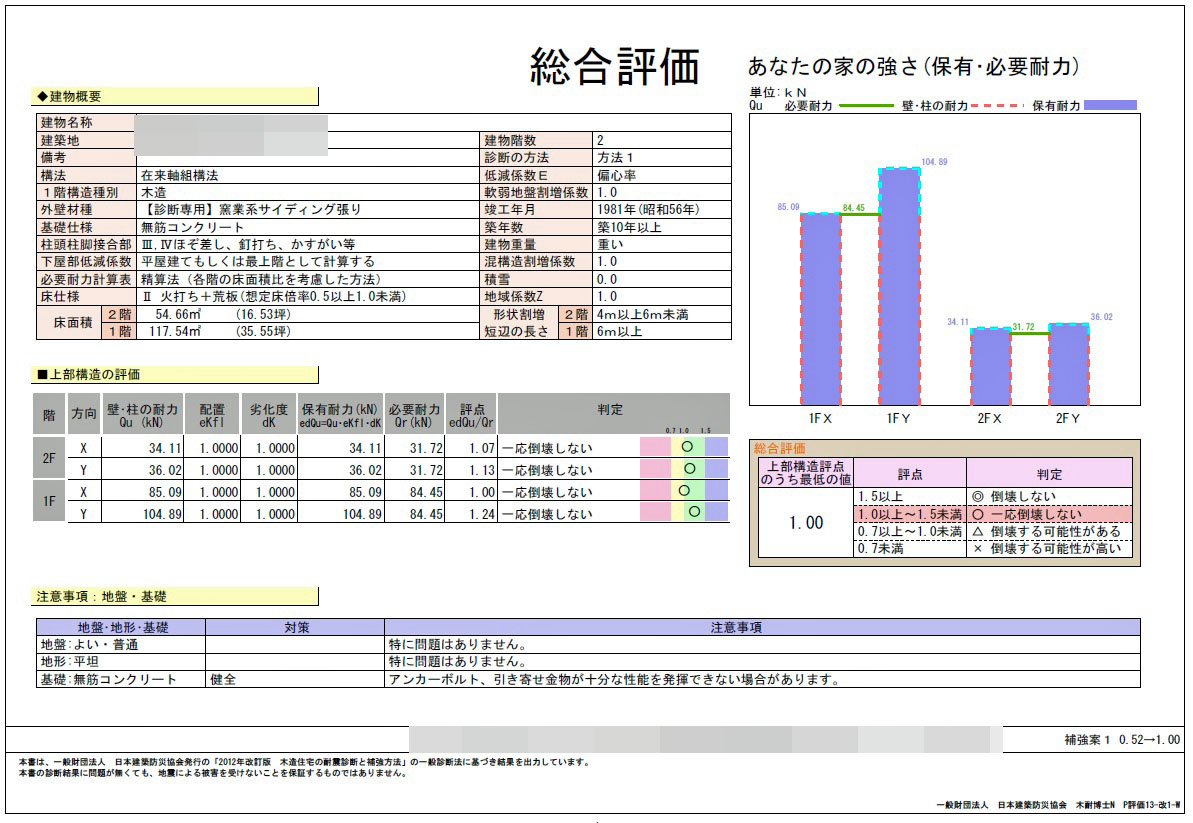 耐震改修後は、一応倒壊しない1.06まで評点を上げました。