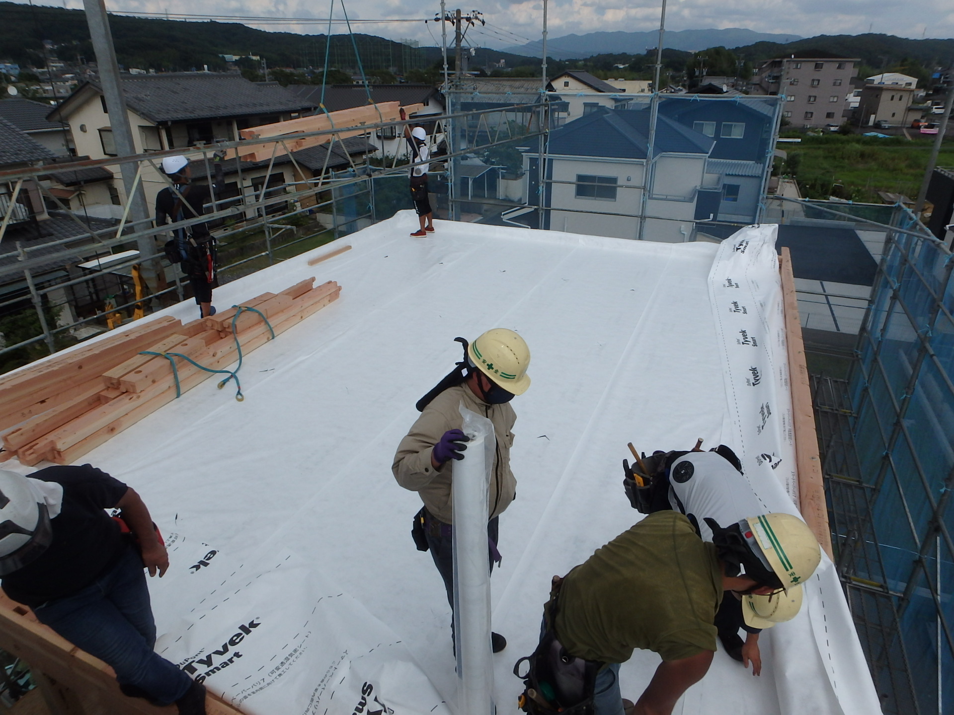 7月29日はタルキを取付け、野地板取付、改質アスファルトルーフィングを敷き込みました。これで雨が降っても一安心です。