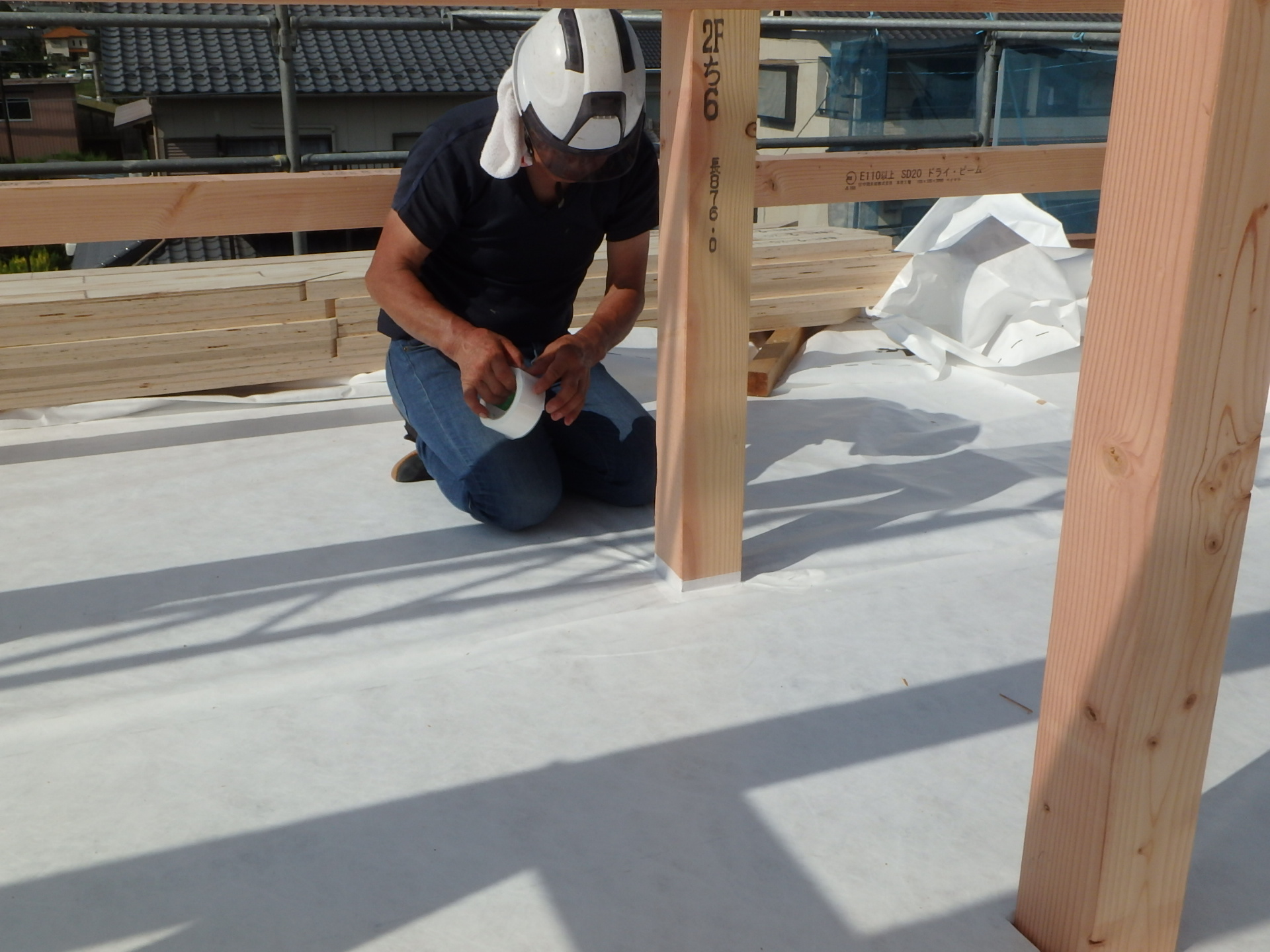 1つ目は合板の気密処理をするために気密テープを桁の上に取付けるので、合板を敷きこむ時に隙間が無いように密着させるようにします。