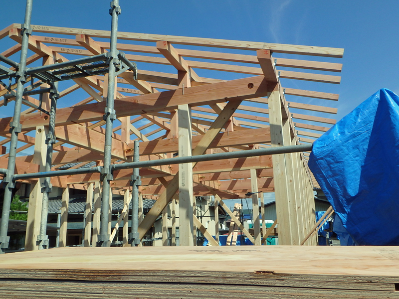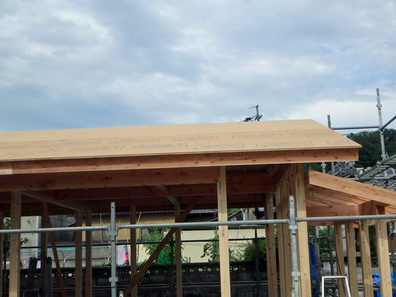 いい天気というより猛暑です。前日に骨組みだけ完成させていたので屋根の工事です。