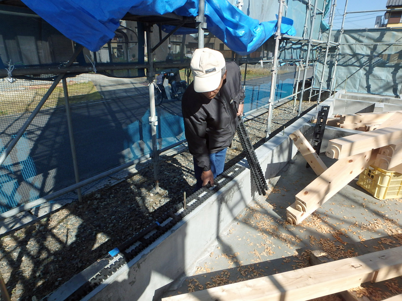 基礎工事が完了して1週間以上たってから土台を基礎と緊結します。