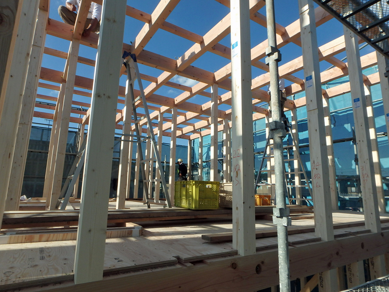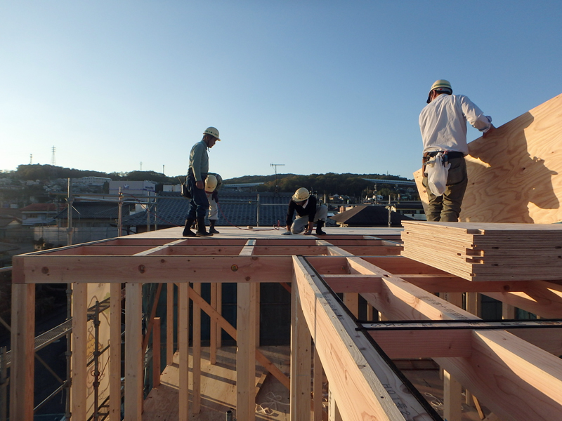 その後、2階の床に耐震性を高めるために24ミリの構造用合板を敷き込みます。