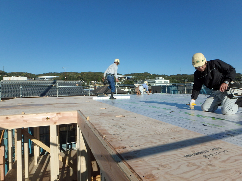 桁上に合板を張り、その上に防湿シートを張って気密性と防湿性を確保します。