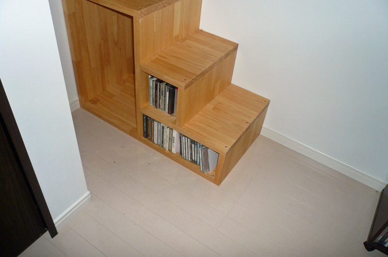低いロフトの階段にはCDの収納です。
