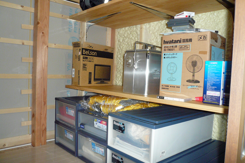 洗面室横のWICの棚板を小屋裏の収納で使っています。