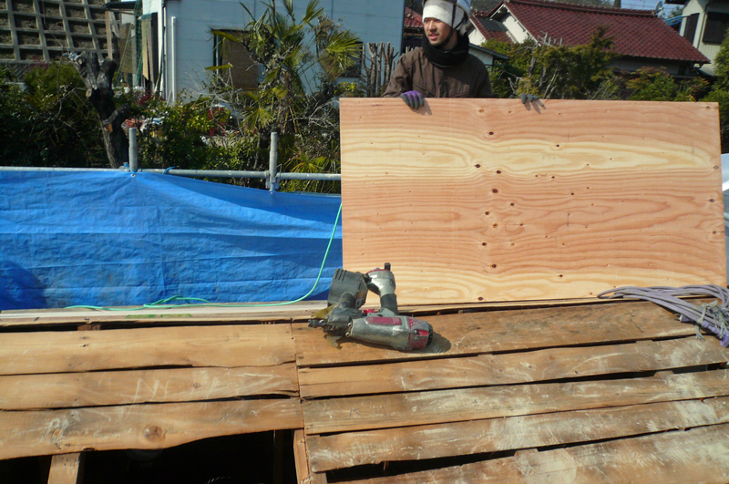 屋根にコンパネを打ちつけます