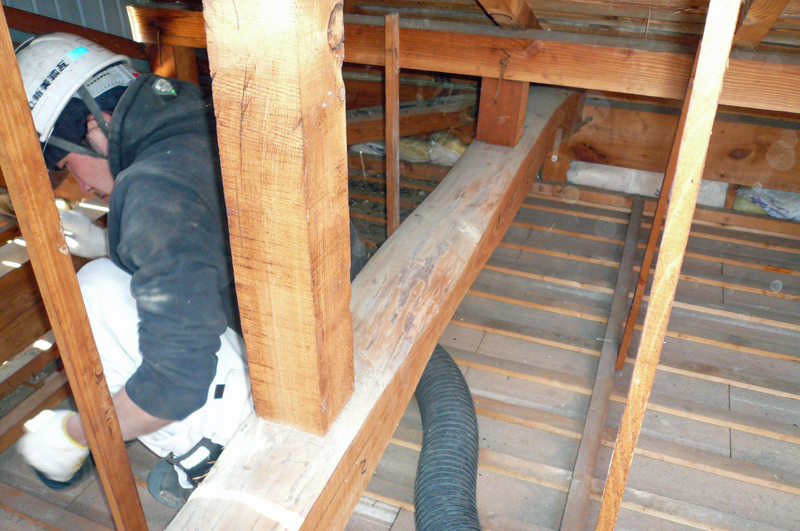 車から伸びたホースで天井裏を掃除します