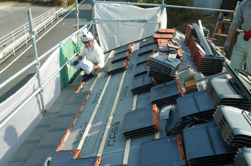 屋根に瓦を止めるための下地材「瓦棒」を取付けて、瓦を取付けます