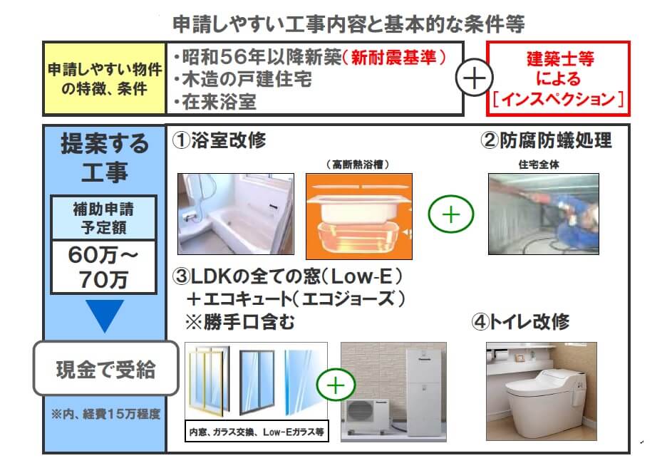 浴室改修(浴槽は高断熱浴槽)、トイレの改修、そしてエコキュート の取替を考えていれば、 追加でLDKの窓断熱工事(内窓取付等と住宅全体の防腐防蟻工事を同時に工事すれば、補助金対象工事になります。