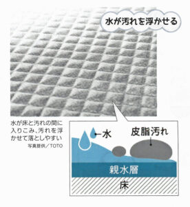 たとえば、床の表面に油をはじくコーティングが施されたものなら、汚れの主な原因となる皮脂を寄せ付けません。また、親水性を持たせた床もあります。親水性とは水になじみやすい性質のことで、床と汚れの間に水が入り込み、汚れを浮かせて落としやすくするものです。