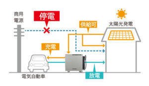 昼間に太陽光発電で創った電気を電気自動車に充電し、夜は電気自動車の電気をご家庭に給電することができます。