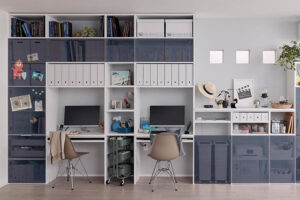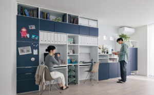 システム収納なら自由にプランニングできるので、棚板などを組み合わせて仕事用のデスクを作れます。