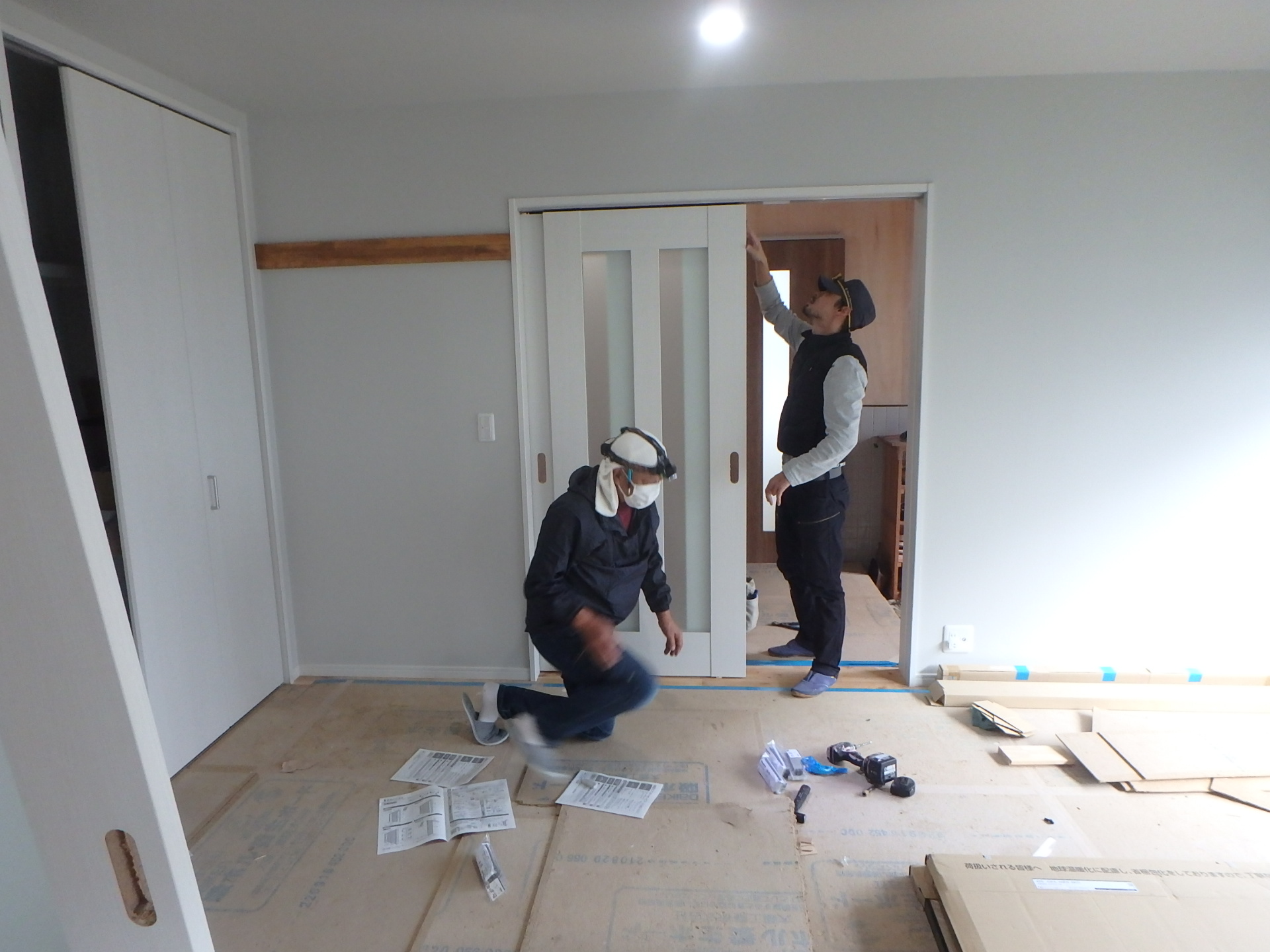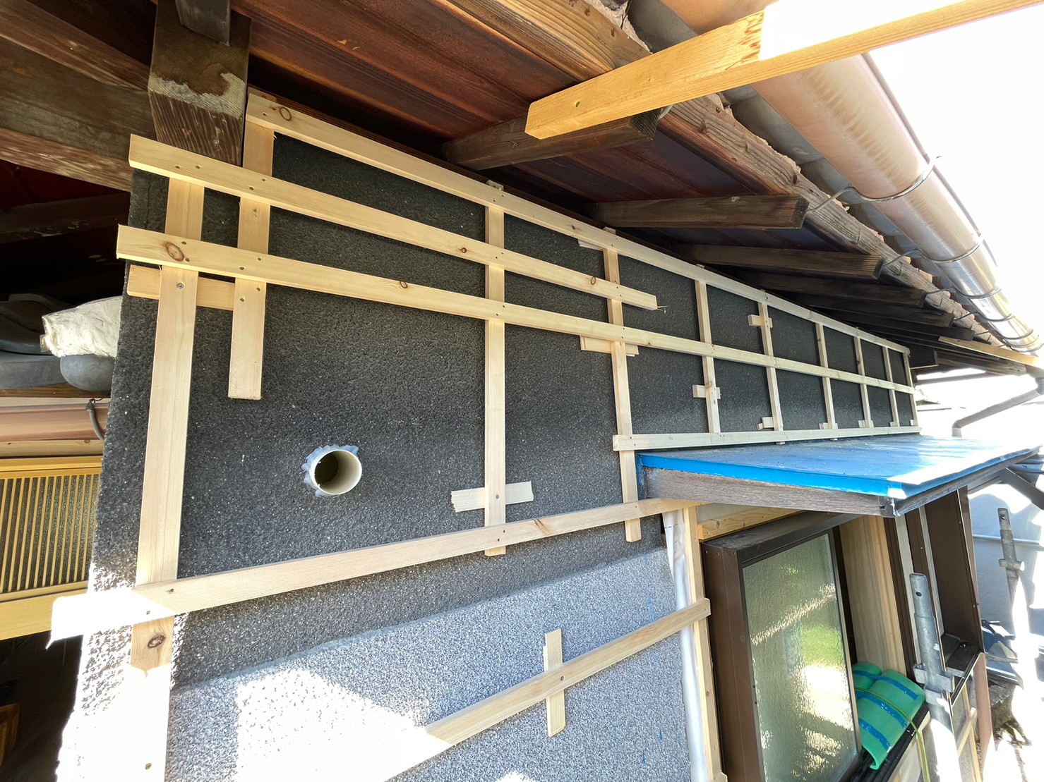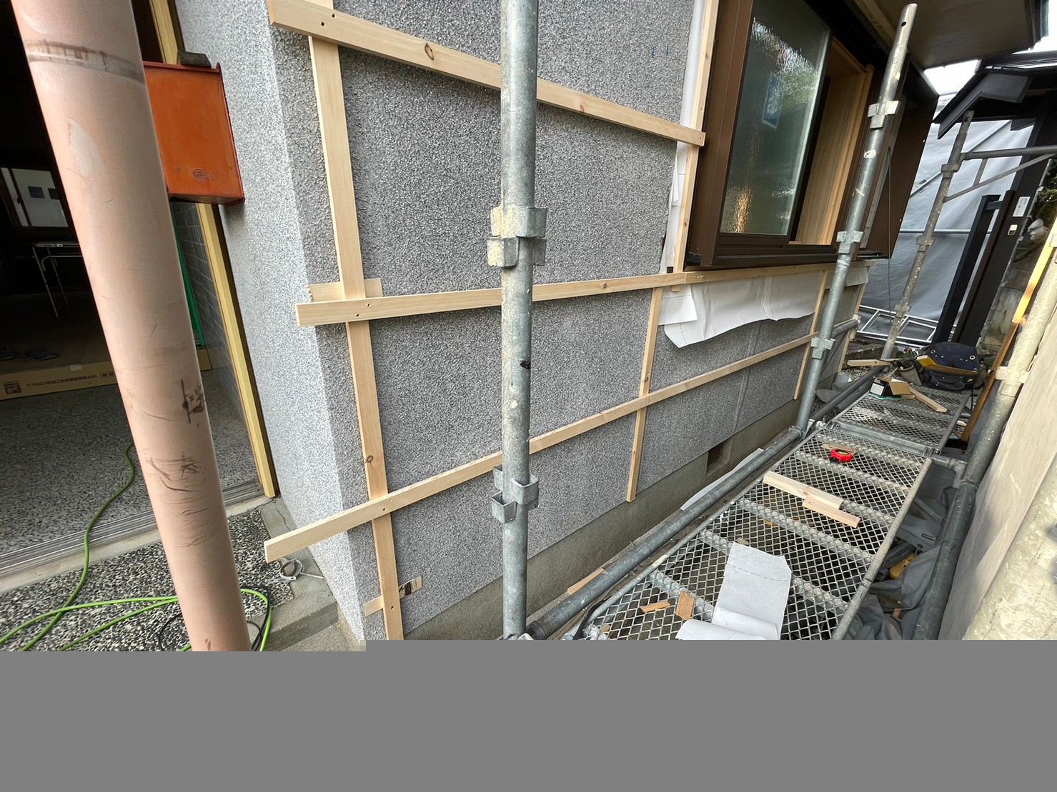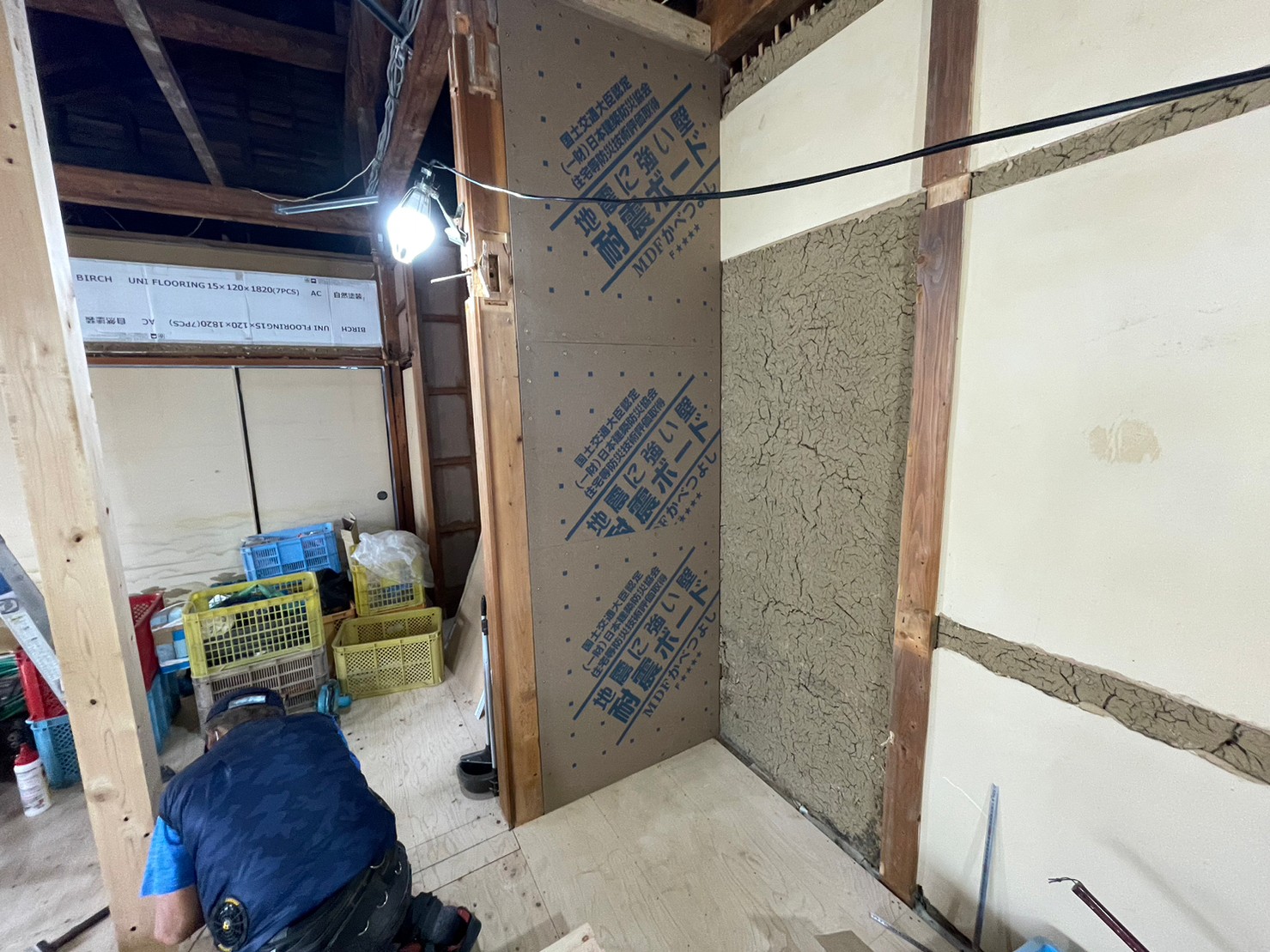 既存柱に下地材を入れて、プラスターボードを張っていきます