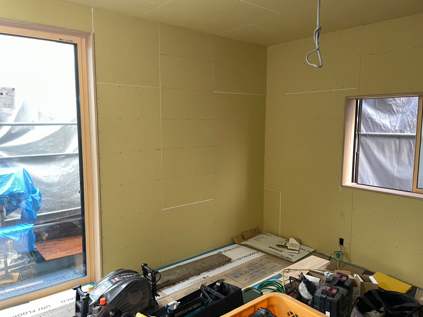 サッシ取付後に耐震パネル(ダイライト)を取付て、防水シートを取付けます