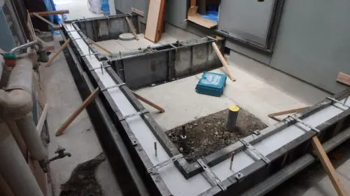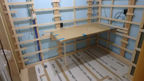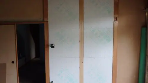 断熱材 スタイロフォームt=60を充填して、内壁下地の木材を入れています。