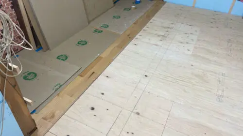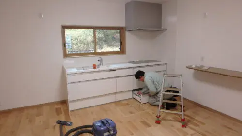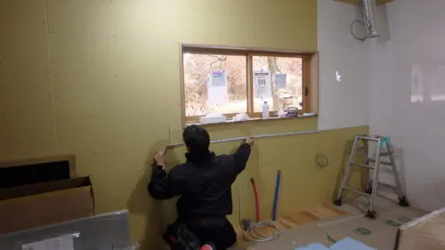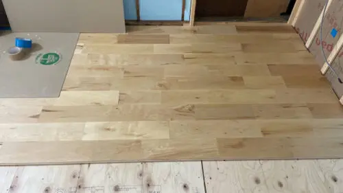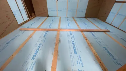 床組+断熱材終了後に下地合板取付を取付けて、無垢サクラフローリングを貼っていきます。