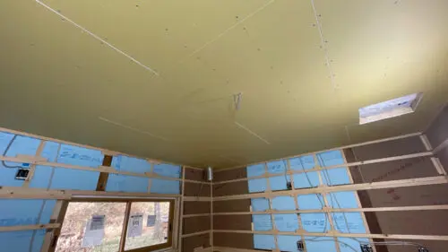 天井の下地を作成して、天井裏に袋入りグラスウール14K t=155を敷き込みます。
