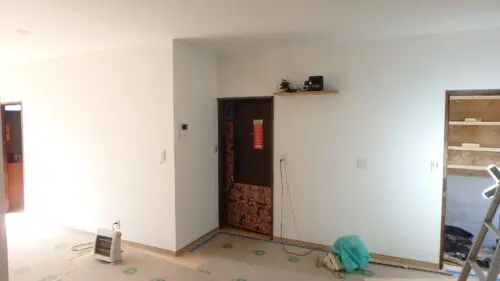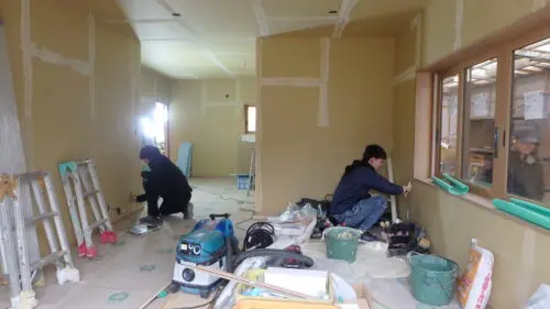 天井・壁のプラスターボードに下地処理をしてクロスを貼ります